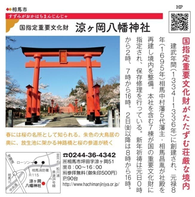皆様、涼ヶ岡八幡神社への理解を一段と深められて、今後外部から相馬を訪れた方々への案内に、大いに役立つものと期待しています。