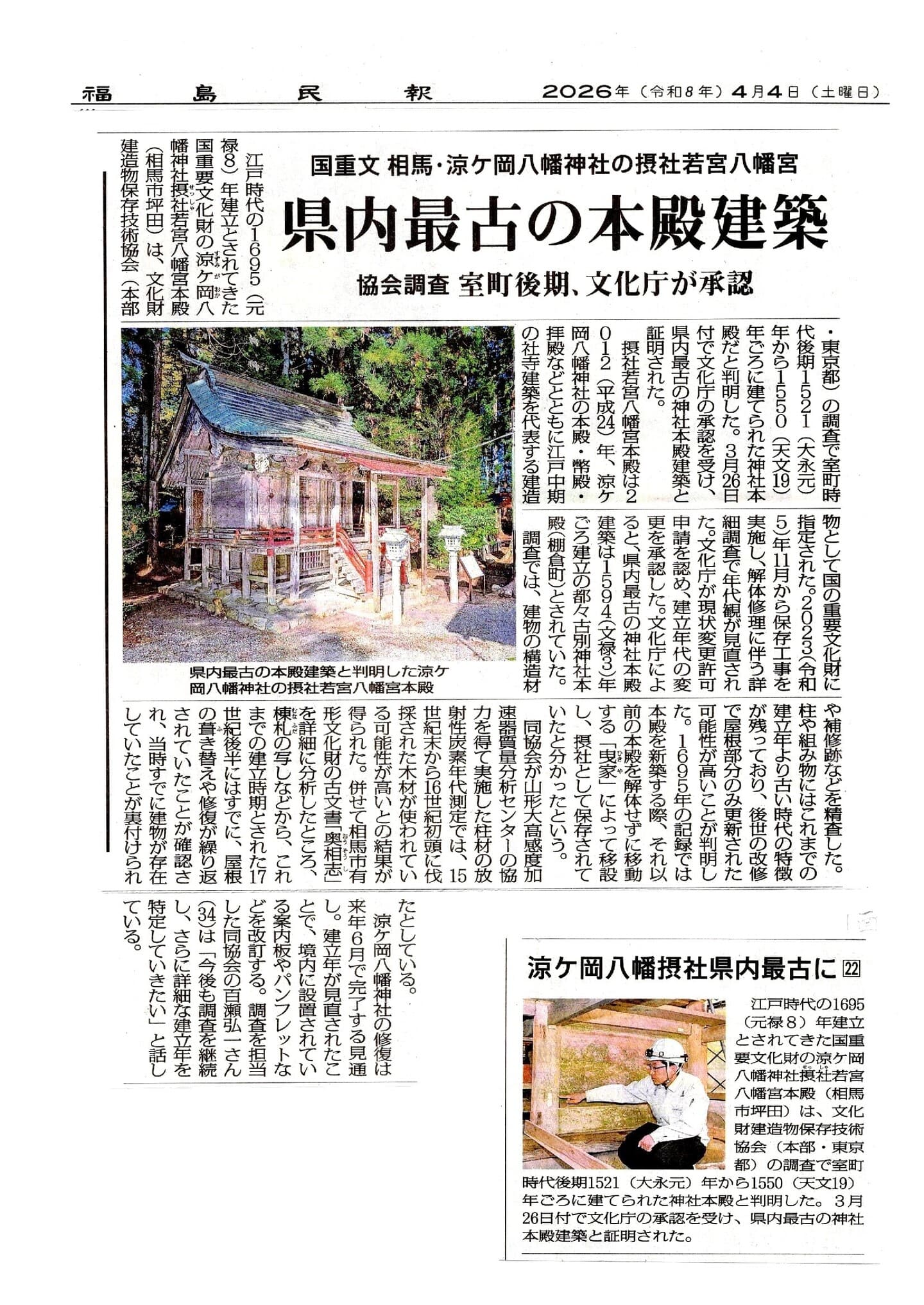 ・その中で摂社の若宮八幡宮が、室町後期の1521(大永元)年から1550(天文19)年頃に建てられた建築物であり、福島県内では最古の神社本殿建築であることが明らかになりました。